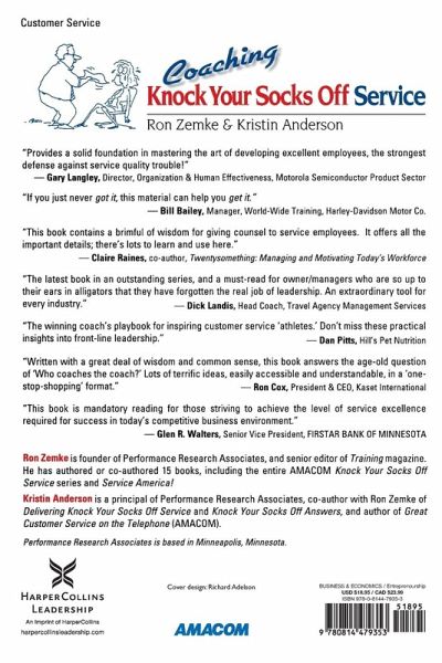Authors Kristin Anderson and Ron Zemke provide a practical guide to the day-to-day challenges that arise in training superior customer service people. Knock your socks off service doesn't just happen. It requires coaching on an ongoing basis. As part of the Knock Your Socks Off series, Coaching Knock Your Socks Off Service explains how to: help frontline employees hone their skills, maintain the motivation to perform, and meet new situations head-on. The authors present a model for successfully coaching anyone, anywhere, and they show you how to apply it in familiar coaching situations. Everyone can appreciate Zemke and Anderson's strategies for handling the toughest coaching problems. You will learn the most important new skill? teaching employees to be peer coaches, a growing need in the current era of teams and of doing more with less.