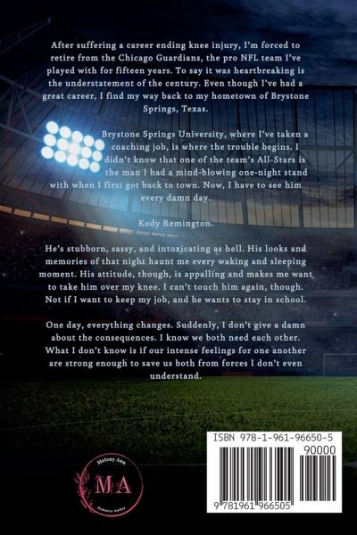 After suffering a career ending knee injury, I'm forced to retire from the Chicago Guardians, the pro NFL team I've played with for fifteen years. To say it was heartbreaking is the understatement of the century. Even though I've had a great career, I find my way back to my hometown of Brystone Springs, Texas. Brystone Springs University, where I've taken a coaching job, is where the trouble begins. I didn't know that one of the team's All-Stars is the man I had a mind-blowing one-night stand with when I first got back to town. Now, I have to see him every damn day. Kody Remington. He's stubborn, sassy, and intoxicating as hell. His looks and memories of that night haunt me every waking and sleeping moment. His attitude, though, is appalling and makes me want to take him over my knee. I can't touch him again, though. Not if I want to keep my job, and he wants to stay in school. One day, everything changes. Suddenly, I don't give a damn about the consequences. I know we both need each other. What I don't know is if our intense feelings for one another are strong enough to save us both from forces I don't even understand.