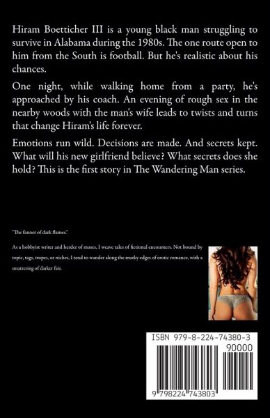 Hiram Boetticher III is a young black man struggling to survive in Alabama during the 1980s. The one route open to him from the South is football. But he's realistic about his chances. One night, while walking home from a party, he's approached by his coach. An evening of rough sex in the nearby woods with the man's wife leads to twists and turns that change Hiram's life forever. Emotions run wild. Decisions are made. And secrets kept. What will his new girlfriend believe? What secrets does she hold? This is the first story in The Wandering Man series.