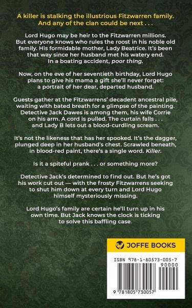 A killer is stalking the illustrious Fitzwarren family. And any of the clan could be next . . . Lord Hugo may be heir to the Fitzwarren millions. But everyone knows who rules the roost in his noble old family. His formidable mother, Lady Beatrice. It's been that way since her husband met his watery end. In a boating accident, poor thing. Now, on the eve of her seventieth birthday, Lord Hugo plans to give his mama a gift she'll never forget: a portrait of her dear, departed husband. Guests gather at the Fitzwarrens' decadent ancestral pile, waiting with bated breath for a glimpse of the painting. Detective Jack Dawes is among them, his wife Corrie on his arm. A cord is pulled. The curtain falls . . . and Lady B lets out a blood-curdling scream. It's not the likeness that has her spooked. It's the dagger, plunged deep in her husband's chest. Scrawled beneath, in blood-red paint, there's a single word. Killer. Is it a spiteful prank . . . or something more? Detective Jack's determined to find out. But he's got his work cut out - with the frosty Fitzwarrens seeking to shut him down at every turn and Lord Hugo himself mysteriously missing. Lord Hugo's family are certain he'll turn up in his own time. But Jack knows the clock is ticking to solve this baffling case. Before something worse than paint is spilled . . . This entertaining and absorbing mystery is perfect for fans of Agatha Christie, LJ Ross, J.R. Ellis, Faith Martin, Catherine Moloney and P.F. Ford. READERS LOVE THE DETECTIVE JACK DAWES MYSTERIES: ¿¿¿¿¿ 'A well-drawn cast of eclectic and credible characters populate a swiftly moving, compelling plot and an engaging narrative.' Ruth G. ¿¿¿¿¿ 'A really enjoyable read . . . A great mystery with a few laugh out loud moments which I couldn't put down.' Kate B. ¿¿¿¿¿¿¿¿¿¿ 'A clever, entertaining and thought-provoking read.' Misfits farm ¿¿¿¿ 'I really enjoyed this book . . . I would happily read more from this author.' Lorraine W. ¿¿¿¿ 'Great plot twist and some crazy twists and turns! The storyline was very interesting and kept me glued to my Kindle!' Debbie B. MEET THE DETECTIVE Detective Inspector Jack Dawes, tall and handsome, looks like the fuzz even when he's off-duty. He rose up through the ranks at Scotland Yard and now is a well-respected detective in the murder squad. A career copper, he was married to the job until he met Coriander during a money laundering investigation, the case which earned him his promotion to DI. He has logical analytical skills. She has intuitive people skills. So he bounces ideas off her. They make a formidable and funny couple whose skills combine to solve crimes.