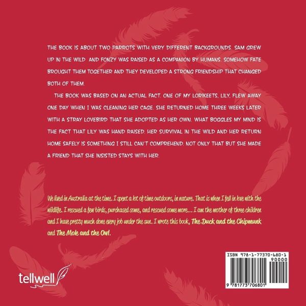 The book is about two parrots with very different backgrounds. Sam grew up in the wild and Fonzy was raised as a companion by humans. Somehow fate brought them together and they developed a strong friendship that changed both of them. The book was based on an actual fact. One of my lorikeets, Lily, flew away one day when I was cleaning her cage. She returned home three weeks later with a stray lovebird that she adopted as her own. What boggles my mind is the fact that Lily was hand raised. Her survival in the wild and her return home safely is something I still can't comprehend. Not only that but she made a friend that she insisted stays with her.