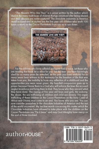 Children working the cocoa plantations for America's chocolate. Would you ever dream of such abuse happening to five-year-old boys and girls, children being worked worse than animals on the cocoa plantations to get the cocoa bean, the main ingredient in chocolate, to America. The cocoa beans are covered with the blood, sweat, and tears of five-year-old children sold for slave labor to work on the cocoa plantations. Everyone has limited freedoms, even in America. We protect our children. They don't have to work on cocoa plantations like five-year-old children in Africa. What should we do about the children who are being abused? Laws are in place. The International Labor Organization, Convention laws, and the Convention of the Rights of the Child, these laws are not being enforced. American people want chocolate but are not aware of the abuse taking place on the Ivory Coast of Africa and Ghana, where 60 percent of the cocoa beans in the world are produced on the cocoa plantations. The cocoa plantations on the Ivory Coast of Africa and Ghana are noted as being the worst form of child slavery in the history of the world. Five-year-old children are working one hundred hours a week. Children are sold into slavery and will never have a childhood or education. Children working to get cocoa beans to America so the chocolate industries can produce chocolate while ignoring the laws in place. Five-year-old children are being raped, sodomized, beaten with bike chains, and possibly murdered trying to escape the cocoa plantations? Chocolate is a trillion-dollar industry. Five-year-old children are being used as child sex slaves, in sex trafficking, and organ trafficking? Why, America, why? Please help the children!