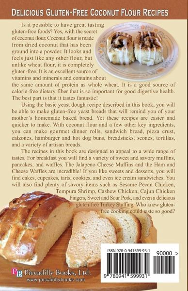 Is it possible to have great tasting gluten-free foods? Yes, with the secret of coconut flour. Coconut flour is made from dried coconut that has been ground into a powder. It looks and feels just like any other flour, but unlike wheat flour, it is completely gluten-free. It is an excellent source of vitamins and minerals and contains about the same amount of protein as whole wheat. It is a good source of calorie-free dietary fiber that is so important for good digestive health. The best part is that it tastes fantastic! Using the basic yeast dough recipe described in this book, you will be able to make gluten-free yeast breads that will remind you of your mother's homemade baked bread. Yet these recipes are easier and quicker to make. With coconut flour and a few other key ingredients, you can make gourmet dinner rolls, sandwich bread, pizza crust, calzones, hamburger and hot dog buns, breadsticks, scones, tortillas, and a variety of artisan breads. The recipes in this book are designed to appeal to a wide range of tastes. For breakfast you will find a variety of sweet and savory muffins, pancakes, and waffles. The Jalapeno Cheese Muffins and the Ham and Cheese Waffles are incredible! If you like sweets and desserts, you will find cakes, cupcakes, tarts, cookies, and even ice cream sandwiches. You will also find plenty of savory items such as Sesame Pecan Chicken, Tempura Shrimp, Cashew Chicken, Cajun Chicken Fingers, Sweet and Sour Pork, and even a delicious gluten-free Turkey Dressing. Who knew gluten-free cooking could taste so good?
