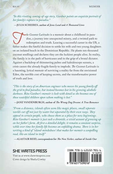 A father makes the fateful decision to leave a successful career in the US behind and move to an isolated beach in the Dominican Republic. He plants ten thousand coconut seedlings, transplants his wife and two young daughters to a small village, and declares they are the luckiest people alive. In reality, the family is in the path of hurricanes and in the grip of a brutal dictator, Rafael Trujillo-and the children are additionally under the thumb of an increasingly volatile and alcoholic father. Set against a backdrop of shimmering palms and kaleidoscope sunsets, The Coconut Latitudes is Rita Gardner's compelling memoir of a childhood in paradise, a journey into unexpected misery, and a twisted path to redemption and truth.
