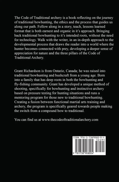The Code of Traditional Archery is a book reflecting on the journey of traditional bowhunting, the ethics and the process that guides us along our path. Following along in a story, teach, lessons learned format that is both earnest and organic in approaching the true process of a hunting legacy. Bringing back traditional bowhunting to its intended roots, without the need for technology. Walk with the writer, in an in-depth approach to the developmental process that draws the reader into a world where the hunter becomes connected with prey, developing a deeper sense of appreciation for nature and environment and the three pillars of the Code of Traditional Archery;Weapons proficiency and shot accuracy, the kinetic and kinesthetic process of shooting a bow effectively for hunting purposes. Ethics to guide us on our journey to ensure effective shot presentations and to be part of the circle of life connecting us with our past. Conservation and stewardship of the environment and connection to the predator/prey cycle that we as hunters understand in a way that is intimately connected to our wild spaces.