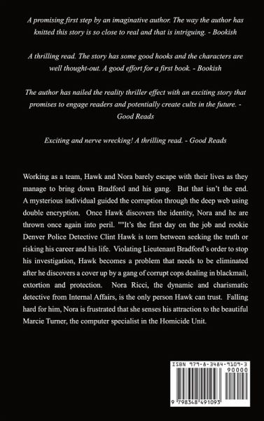 It's the first day on the job and rookie Denver Police Detective Clint Hawk is torn between seeking the truth or risking his career and his life. Violating Lieutenant Bradford's order to stop his investigation, Hawk becomes a problem that needs to be eliminated after he discovers a cover up by a gang of corrupt cops dealing in blackmail, extortion and protection. Nora Ricci, the dynamic and charismatic detective from Internal Affairs, is the only person Hawk can trust. Falling hard for him, Nora is frustrated that she senses his attraction to the beautiful Marcie Turner, the computer specialist in the Homicide Unit. Working as a team, Hawk and Nora barely escape with their lives as they manage to bring down Bradford and his gang. But that isn't the end. A mysterious individual guided the corruption through the deep web using double encryption. Once Hawk discovers the identity, Nora and he are thrown once again into peril.