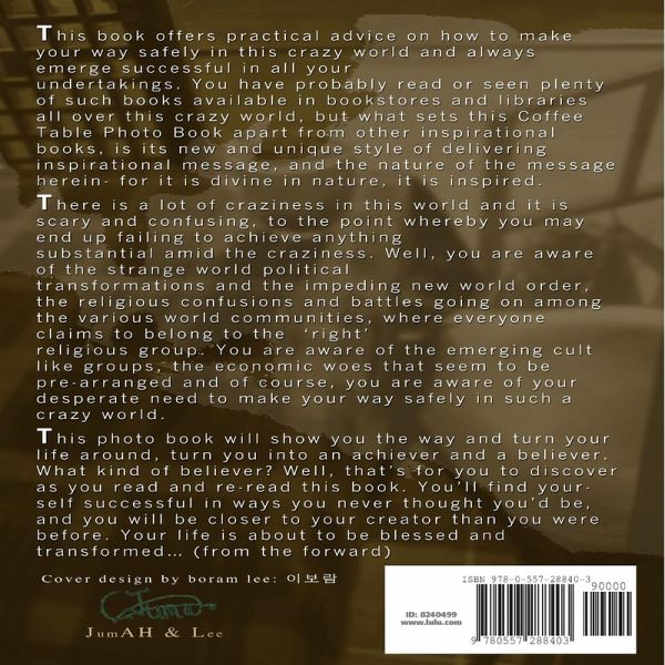 There is a lot of craziness in this world and it is scary and confusing, to the point whereby you may end up failing to achieve anything substantial amid the craziness. Well, you are aware of the strange world political transformations and the impeding new world order, the religious confusions and battles going on among the various world communities, where everyone claims to belong to the 'right' religious group. You are aware of the emerging cult like groups, the economic woes that seem to be pre-arranged and of course, you are aware of your desperate need to make your way safely in such a crazy world. This photo book will show you the way and turn your life around, turn you into an achiever and a believer. This photo book is ideal for your coffee table; bathroom, waiting room, and everywhere where you and your guests can gain wisdom while you relax or wait! Does this photo book also contain words of prophesy? Well, that's for you to find out.
