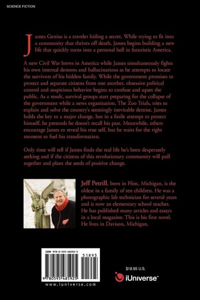 James Genius is a traveler hiding a secret. While trying to fit into a community that thrives off death, James begins building a new life that quickly turns into a personal hell in futuristic America. A new Civil War brews in America while James simultaneously fights his own internal demons and hallucinations as he attempts to locate the survivors of his hidden family. While the government promises to protect and separate citizens from one another, obsessive political control and suspicious behavior begins to confuse and upset the public. As a result, survival groups start preparing for the collapse of the government while a news organization, The Zoo Trials, tries to explain and solve the country's seemingly inevitable demise. James holds the key to a major change, but in a futile attempt to protect himself, he pretends he doesn't recall his past. Meanwhile, others encourage James to reveal his true self, but he waits for the right moment to fuel his transformation. Only time will tell if James finds the real life he's been desperately seeking and if the citizens of this revolutionary community will pull together and plant the seeds of positive change.