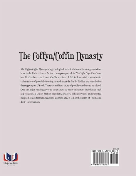 The Coffyn/Coffin Dynasty is a genealogical recapitulation of fifteen generations born in the United States. At first, I was going to title it The Coffin Saga Continues, but R. Gardner and Louis Coffin expired. I fell in love with a wonderful culmination of people belonging to my husband's family. I added the years before the stepping on US soil. There are millions more of people out there to be added. One can enjoy reading cover to cover about so many important individuals such as presidents, a Union Station president, aviators, college owners, and patented people besides farmers, teachers, doctors, etc. It is not the norm of "born and died" information.