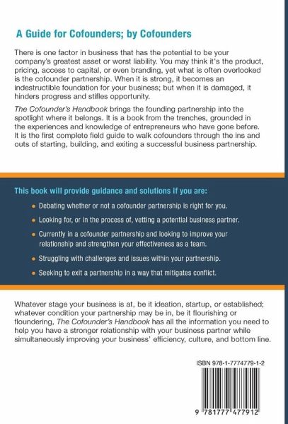 The Cofounder's Handbook brings business partnerships into the spotlight where they belong. Most people don't realize how much their partnership affects the strength of their business. The right cofounder multiplies your success. But the wrong partner divides your attention and effort, hinders your business's progress, and potentially destroys it from within. The Cofounder's Handbook is designed to help you succeed in your partnership no matter what stage you are in; taken from the insights and perspectives of numerous cofounders who suffered from partnerships gone wrong and excelled alongside the right person. Unlike theoretical advice from business coaches and academics, this book provides practical, proven tips and tools real-world cofounders have used to build rewarding partnerships and grow their companies successfully, together. This book covers the three stages of a partnership and how to succeed within each one along the way. Some of the topics include: * Determine whether a partnership is right for you * What to look for in a business partner * The conversations you MUST have before signing * Which contracts you need to formalize your partnership * How to decide equity, roles, and titles * Methods for effective communication * How to build trust for a lasting partnership * Warning signs your partnership is headed for trouble * How to handle and undertake difficult conversations * How to determine whether the partnership is salvageable * Who to turn to in order to navigate an exit * And so much more! This is a book from the trenches, grounded in the experiences and knowledge of entrepreneurs who have gone before. It is the first complete field guide to walk cofounders through the ins and outs of starting, building, and exiting a successful business partnership.