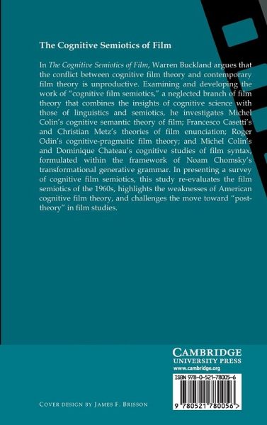 In The Cognitive Semiotics of Film, Warren Buckland argues that the conflict between cognitive film theory and contemporary film theory is unproductive. Examining and developing the work of 'cognitive film semiotics', a neglected branch of film theory that combines the insights of cognitive science with those of linguistics and semiotics, he investigates Michel Colin's cognitive semantic theory of film; Francesco Casetti and Christian Metz's theories of film enunciation; Roger Odin's cognitive-pragmatic film theory; and Michel Colin and Dominique Chateau's cognitive studies of film syntax, which are viewed within the framework of Noam Chomsky's transformational generative grammar. Presenting a survey of cognitive film semiotics, this study also re-evaluates the film semiotics of the 1960s, highlights the weaknesses of American cognitive film theory, and challenges the move toward 'post-theory' in film studies.