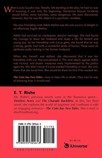 When Lucas Gaudin was, literally, left standing at the altar, he had no way of knowing it was only the beginning. Numerous bizarre incidents would follow, some harmless, some dangerous. He soon discovered, however, that he was the object of a psychotic vendetta. His new friendship with Adele Mallot was the one source of delight in an otherwise fragile destiny. Adele had survived an unpleasant, abusive marriage. She had found the courage to leave her husband and make a life for herself and young son. As her friendship with Lucas grew, she found that he was a strong, gentle man with a wonderful sense of humor. These were all attributes sadly lacking in her former husband. When she, herself, was stalked, she discovered that it was her friendship with Luc that precipitated it. The next attack against Adele was vicious, and drastic measures were implemented by the police agencies. She didn't know if Lucas wanted friendship or love, she only knew that she loved him. She would be there for him if he wanted her. The Coin has Two Sides--love or hate; life or death. They had no way of knowing how it would end.