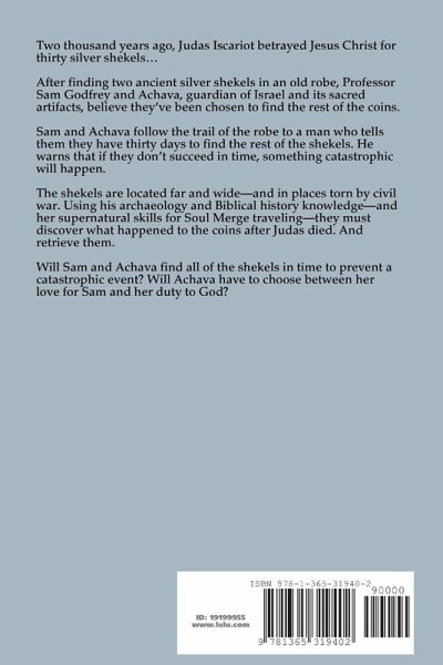 Two thousand years ago, Judas Iscariot betrayed Jesus Christ for thirty silver shekels... After finding two ancient silver shekels in an old robe, Professor Sam Godfrey and Achava, guardian of Israel and its sacred artifacts, believe they've been chosen to find the rest of the coins... Sam and Achava follow the trail of the robe to a man who tells them they have thirty days to find the rest of the shekels. He warns that if they don't succeed in time, something catastrophic will happen... The shekels are located far and wide-and in places torn by civil war. Using his archaeology and Biblical history knowledge-and her supernatural skills for Soul Merge traveling-they must discover what happened to the coins after Judas died. And retrieve them... Will Sam and Achava find all of the shekels in time to prevent a catastrophic event? Will Achava have to choose between her love for Sam and her duty to God?