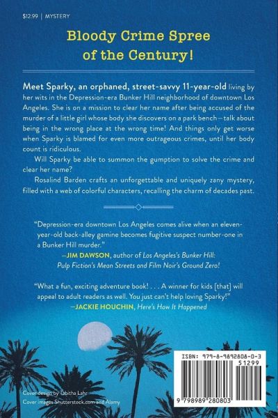 Bloody Crime Spree of the Century! Meet Sparky, an orphaned, street-savvy 11-year-old living by her wits in the Depression-era Bunker Hill neighborhood of downtown Los Angeles. She is on a mission to clear her name after being accused of the murder of a little girl whose body she discovers on a park bench-talk about being in the wrong place at the wrong time! And things only get worse when Sparky is blamed for ever more outrageous crimes until her body count is ridiculous. Will Sparky be able to summon the gumption to solve the crime and clear her name? Rosalind Barden crafts an unforgettable and uniquely zany mystery, filled with a web of colorful characters, recalling the charm of decades past, with Hollywood, movie stars, mobsters, and, of course, murder. The Cold Kid Case, the first in Rosalind Barden's Sparky of Bunker Hill Mystery series, has been awarded multiple accolades, including the Firebird Book Award 1st Place for Cozy Mysteries. The crime-solving misadventures of Sparky, the most unlikely amateur sleuth, continue with The Cannibal Caper, The Monkey Island Murder, The South Seas Shenanigans, and coming in 2025, The Catalina Cahoots.