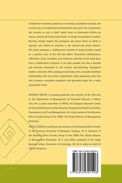 Competitive economics produces an enormous abundance of goods and services but at an intolerable environmental and social cost. Competition has become an end in itself, which leads to detrimental effects on nature, society and future generations. A change of paradigm is needed. Business should respect the ecological and social limits in which it operates and embed its activities in the natural and social systems. This book promotes a collaborative attitude of doing business based on a positive view of the self and others. Theoretical contributions, reflections, cases, examples, and initiatives collected in the book show that a collaborative enterprise is not only possible but also a feasible and desirable alternative to the current, self-defeating, managerial models. Innovative firms seeking to build long-term, mutually beneficial relationships with all of their stakeholders while producing values for their business ecosystems represent well-grounded hopes for a really sustainable future.