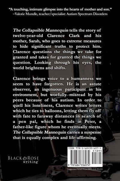 The Collapsible Mannequin tells the story of twelve-year-old Clarence Clark and his mother, Sarah, who goes to extreme measures to hide significant truths to protect him. Clarence questions the things we take for granted and takes for granted the things we question. Looking through his eyes, the world brightens and shifts. Clarence brings voice to a humanness we seem to have forgotten. He is an astute observer, an ingenuous participant in his environment, but woefully misread by his peers because of his autism. In order to quell his loneliness, Clarence writes letters which he ties to balloons, letting them fly off with fate to faraway distances in search of a pen pal, which he finds in Peter, a father-like figure whom he eventually meets. The Collapsible Mannequin carries a suspense that is equally complex and life-affirming.
