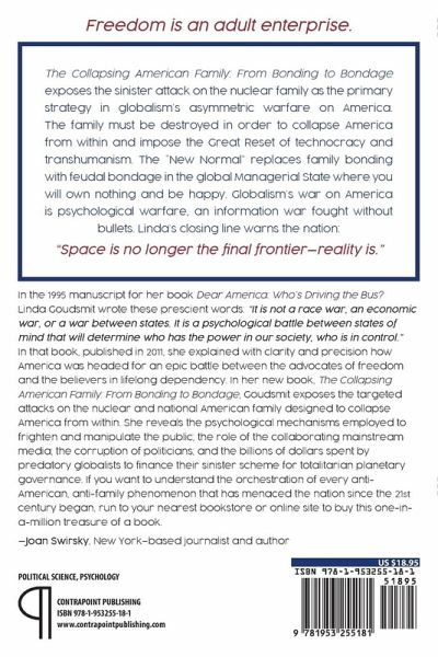 The Collapsing American Family: From Bonding to Bondage exposes the sinister attack on the nuclear family as the primary strategy in globalism's asymmetric warfare on America. The family must be destroyed in order to collapse America from within and impose the Great Reset of technocracy and transhumanism. The "New Normal" replaces family bonding with feudal bondage in the global Managerial State where you will own nothing and be happy. Globalism's war on America is psychological warfare, an information war fought without bullets. Linda's closing line warns the nation: "Space is no longer the final frontier-reality is." In the 1995 manuscript for her book Dear America: Who's Driving the Bus? Linda Goudsmit wrote these prescient words: 'It is not a race war, an economic war, or a war between states. It is a psychological battle between states of mind that will determine who has the power in our society, who is in control.' In that book, published in 2011, she explained with clarity and precision how America was headed for an epic battle between the advocates of freedom and the believers in lifelong dependency. In her new book, The Collapsing American Family: From Bonding to Bondage, Goudsmit exposes the targeted attacks on the nuclear and national American family designed to collapse America from within. She reveals the psychological mechanisms employed to frighten and manipulate the public; the role of the collaborating mainstream media; the corruption of politicians; and the billions of dollars spent by predatory globalists to finance their sinister scheme for totalitarian planetary governance. If you want to understand the orchestration of every anti-American, anti-family phenomenon that has menaced the nation since the 21st century began, this one-in-a-million treasure of a book explains it.