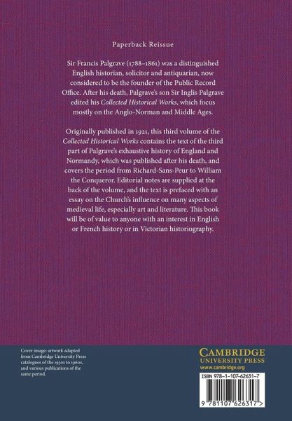 Sir Francis Palgrave (1788-1861) was a distinguished English historian, solicitor and antiquarian, now considered to be the founder of the Public Record Office. After his death, Palgrave's son Sir Inglis Palgrave edited his Collected Historical Works, which focus mostly on the Anglo-Norman and Middle Ages. Originally published in 1921, this third volume of the Collected Historical Works contains the text of the third part of Palgrave's exhaustive history of England and Normandy, which was published after his death, and covers the period from Richard-Sans-Peur to William the Conqueror. Editorial notes are supplied at the back of the volume, and the text is prefaced with an essay on the Church's influence on many aspects of medieval life, especially art and literature. This book will be of value to anyone with an interest in English or French history or in Victorian historiography.