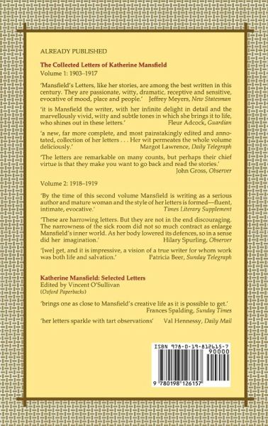 The third volume of the Collected Letters of Katherine Mansfield covers the eight months she spent in Italy and the South of France between the English summers of 1919 and 1920. It was a time of intense personal reassessment and distress. Mansfield's relationship with her husband John Middleton Murry was bitterly tested, and most of the letters in this present volume chart that rich and enduring partner'ship through its severest trial. This was a time, too, when Mansfield came to terms with the closing off of possibilities that her illness entailed. Without flamboyance or fuss, she felt it necessary to discard earlier loyalties and even friendships, as she sought for a spiritual standpoint that might turn her illness to less negative ends. As she put it, 'One must be ... continually giving & receiving, and shedding & renewing, & examining & trying to place'. For all the grimness of this period of her life, Mansfield's letters still offer the joie de vivre and wit, self-perception and lively frankness that make her correspondence such rewarding reading - an invaluable record of a `modern' woman and her time.