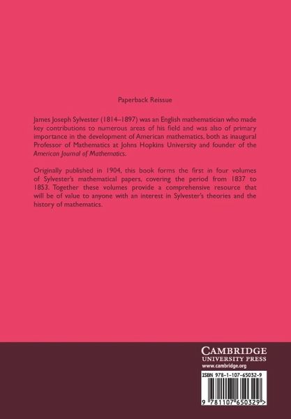 James Joseph Sylvester (1814-97) was an English mathematician who made key contributions to numerous areas of his field and was also of primary importance in the development of American mathematics, both as inaugural Professor of Mathematics at Johns Hopkins University and founder of the American Journal of Mathematics. Originally published in 1904, this book forms the first in four volumes of Sylvester's mathematical papers, covering the period from 1837 to 1853. Together these volumes provide a comprehensive resource that will be of value to anyone with an interest in Sylvester's theories and the history of mathematics.