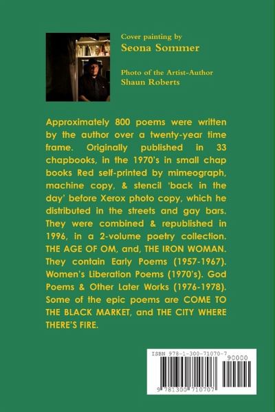 Approximately 800 poems were written by the author over a twenty-year time frame. Originally published in 33 chapbooks, in the 1970's in small chap books Red self-printed by mimeograph, machine copy, & stencil 'back in the day' before Xerox photo copy, which he distributed in the streets and gay bars. They were combined & republished in 1996, in a 2-volume poetry collection. THE AGE OF OM, and, THE IRON WOMAN. They contain Early Poems (1957-1967). Women's Liberation Poems (1970's). God Poems & Other Later Works (1976-1978). Some of the epic poems are COME TO THE BLACK MARKET, and THE CITY WHERE THERE'S FIRE!