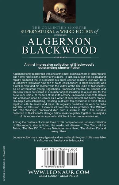 A third impressive collection of Blackwood's outstanding shorter fiction Algernon Henry Blackwood was one of the most prolific authors of supernatural and horror fiction in the history of the genre. In fact, his output was so great and rapidly produced that it is possible his entire cannon remains unknown. Born in Shooter's Hill (which now part of south-east London) in 1869, his father was a civil servant and his mother was the widow of the 6th Duke of Manchester. As an adventurous young Englishman, Blackwood travelled to Canada and the USA where he worked at a number of jobs including as a journalist for the 'New York Times'. At the turn of the 20th century Blackwood returned to Britain and embarked upon his career as a writer of supernatural and horror stories. His output was astonishing, resulting in at least ten collections of short stories together with 14 novels and plays. He regularly broadcast his work on radio and later on television. His two best known stories are probably, 'The Willows' and 'The Wendigo'. Blackwood died from a stroke in 1951. The Leonaur collection of Blackwood's strange fiction seeks to gather together the majority of his known shorter supernatural fiction into a comprehensive set. Among the contents of volume three of this comprehensive Leonaur collection of Blackwood's shorter fiction, the reader will discover, ' The Terror of the Twins', 'The Sea Fit', 'You may Telephone from Here', 'The Golden Fly' and many others. Leonaur editions are newly typeset and are not facsimiles; each title is available in softcover and hardback with dustjacket.