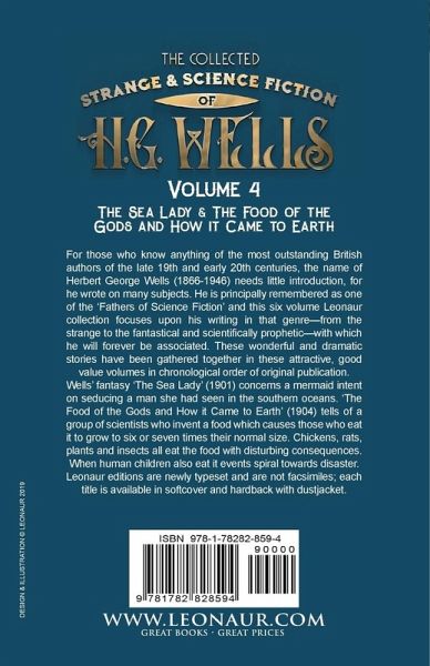 Volume 4-The Sea Lady & The Food of the Gods and How it Came to Earth For those who know anything of the most outstanding British authors of the late 19th and early 20th centuries, the name of Herbert George Wells (1866-1946) needs little introduction, for he wrote on many subjects. He is principally remembered as one of the 'Fathers of Science Fiction' and this six volume Leonaur collection focuses upon his writing in that genre-from the strange to the fantastical and scientifically prophetic-with which he will forever be associated. These wonderful and dramatic stories have been gathered together in these attractive, good value volumes in chronological order of original publication. Wells' fantasy 'The Sea Lady' (1901) concerns a mermaid intent on seducing a man she had seen in the southern oceans. 'The Food of the Gods and How it Came to Earth' (1904) tells of a group of scientists who invent a food which causes those who eat it to grow to six or seven times their normal size. Chickens, rats, plants and insects all eat the food with disturbing consequences. When human children also eat it events spiral towards disaster. Leonaur editions are newly typeset and are not facsimiles; each title is available in softcover and hardback with dustjacket.