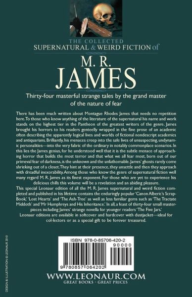 Thirty-four masterful strange tales by the grand master of the nature of fear There has been much written about Montague Rhodes James that needs no repetition here. To those who know anything of the literature of the supernatural his name and work stands on the highest tier in the Pantheon of the greatest writers of the genre. James brought his horrors to his readers genteelly wrapped in the fine prose of an academic often describing the apparently logical lives and worlds of fictional nondescript academics and antiquarians. Brilliantly, his menaces creep into the safe lives of unsuspecting, undynamic personalities-into the very fabric of the ordinary in notably commonplace scenarios. In this lies the James genius, for he understood well that it is the subtle menace of approaching horror that builds the most terror and that what we all fear most, born out of our primeval fear of darkness, is the unknown and the unfathomable. James' ghosts rarely come shrieking out of a closet. They hint at their presence, they unsettle and then they approach with dreadful inexorability. Among those who know the genre of supernatural fiction well many regard M. R. James as its finest exponent. For those who are yet to experience his delicious chills this volume will be a revelation and an abiding pleasure. This special Leonaur edition of all the M. R. James supernatural and weird fiction completed and published in his lifetime contains the enduringly popular 'Canon Alberic's Scrap-Book,' 'Lost Hearts' and 'The Ash-Tree' as well as less familiar gems such as 'The Tractate Middoth' and 'Mr Humphreys and His Inheritance.' In all, a feast of thirty-four small masterpieces including James' strange novella for younger readers 'The Five Jars.' Leonaur editions are newly typeset and are not facsimiles; each title is available in softcover and hardback with dustjacket-ideal for collectors or as a special gift to be forever treasured.