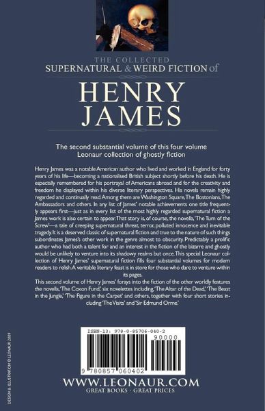 The second substantial volume of this four volume Leonaur collection of ghostly fiction Henry James was a notable American author who lived and worked in England for forty years of his life-becoming a nationalised British subject shortly before his death. He is especially remembered for his portrayal of Americans abroad and for the creativity and freedom he displayed within his diverse literary perspectives. His novels remain highly regarded and continually read. Among them are Washington Square, The Bostonians, The Ambassadors and others. In any list of James' notable achievements one title frequently appears first-just as in every list of the most highly regarded supernatural fiction a James work is also certain to appear. That story is, of course, the novella, 'The Turn of the Screw'-a tale of creeping supernatural threat, terror, polluted innocence and inevitable tragedy. It is a deserved classic of supernatural fiction and true to the nature of such things subordinates James's other work in the genre almost to obscurity. Predictably a prolific author who had both a talent for and an interest in the fiction of the bizarre and ghostly would be unlikely to venture into its shadowy realms but once. This special Leonaur collection of Henry James' supernatural fiction fills four substantial volumes for modern readers to relish. A veritable literary feast is in store for those who dare to venture within its pages. This second volume of Henry James' forays into the fiction of the other worldly features the novella, 'The Coxon Fund,' six novelettes including, 'The Altar of the Dead,' 'The Beast in the Jungle,' 'The Figure in the Carpet' and others, together with four short stories including 'The Visits' and 'Sir Edmund Orme.'