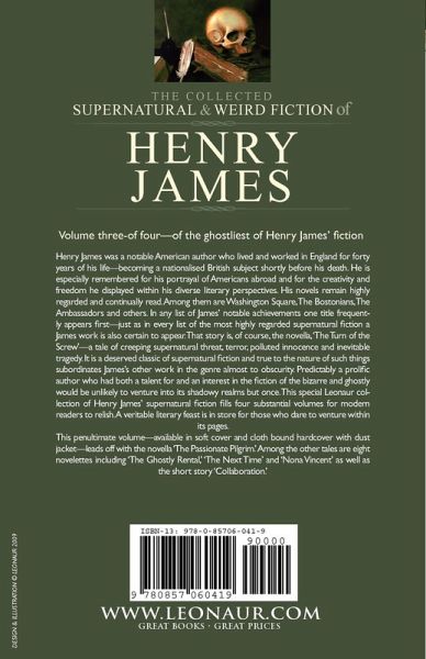 Volume three-of four-of the ghostliest of Henry James' fiction Henry James was a notable American author who lived and worked in England for forty years of his life-becoming a nationalised British subject shortly before his death. He is especially remembered for his portrayal of Americans abroad and for the creativity and freedom he displayed within his diverse literary perspectives. His novels remain highly regarded and continually read. Among them are Washington Square, The Bostonians, The Ambassadors and others. In any list of James' notable achievements one title frequently appears first-just as in every list of the most highly regarded supernatural fiction a James work is also certain to appear. That story is, of course, the novella, 'The Turn of the Screw'-a tale of creeping supernatural threat, terror, polluted innocence and inevitable tragedy. It is a deserved classic of supernatural fiction and true to the nature of such things subordinates James's other work in the genre almost to obscurity. Predictably a prolific author who had both a talent for and an interest in the fiction of the bizarre and ghostly would be unlikely to venture into its shadowy realms but once. This special Leonaur collection of Henry James' supernatural fiction fills four substantial volumes for modern readers to relish. A veritable literary feast is in store for those who dare to venture within its pages. This penultimate volume-available in soft cover and cloth bound hardcover with dust jacket-leads off with the novella 'The Passionate Pilgrim.' Among the other tales are eight novelettes including 'The Ghostly Rental,' 'The Next Time' and 'Nona Vincent' as well as the short story 'Collaboration.'