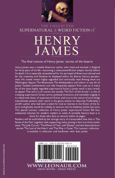 The final volume of Henry James' stories of the bizarre Henry James was a notable American author who lived and worked in England for forty years of his life-becoming a nationalised British subject shortly before his death. He is especially remembered for his portrayal of Americans abroad and for the creativity and freedom he displayed within his diverse literary perspectives. His novels remain highly regarded and continually read. Among them are Washington Square, The Bostonians, The Ambassadors and others. In any list of James' notable achievements one title frequently appears first-just as in every list of the most highly regarded supernatural fiction a James work is also certain to appear. That story is, of course, the novella, 'The Turn of the Screw'-a tale of creeping supernatural threat, terror, polluted innocence and inevitable tragedy. It is a deserved classic of supernatural fiction and true to the nature of such things subordinates James's other work in the genre almost to obscurity. Predictably a prolific author who had both a talent for and an interest in the fiction of the bizarre and ghostly would be unlikely to venture into its shadowy realms but once. This special Leonaur collection of Henry James' supernatural fiction fills four substantial volumes for modern readers to relish. A veritable literary feast is in store for those who dare to venture within its pages. Readers will be enthralled by the strange story of transcended time that is 'The Sense of the Past' together with supporting notes. Joining it here are three novelettes, 'The Jolly Corner,' 'The Wheel of Time' and 'Glasses' and two featured short stories 'The Last of the Valerii' and 'The Way it Came'. Leonaur editions are newly typeset and are not facsimiles; each title is available in softcover and hardback with dustjacket -a credit to your book case.