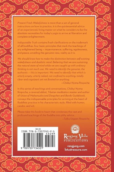 The Collected Works of Chökyi Nyima Rinpoche, Volume II In this series of teachings and conversations, Chökyi Nyima Rinpoche, a revered abbot, Tibetan meditation master and author conveys the indispensable principles for arriving at the heart of Buddhist practice in his characteristic style, filled with humor, candor, and wit. Indisputable Truth contains fresh clarifications on the trademark of all buddhas, four basic principles that mark the teachings of any enlightened being — impermanence, suffering, egolessness, and peace; unveiling the genuine view, reality as it is. Present Fresh Wakefulness is more than a set of general instructions on how to practice, it is the quintessential advice of an experienced, living master on what he considers to be the absolute necessities for today’s yogis to arrive at liberation and complete enlightenment. Chökyi Nyima Rinpoche is at every point sensitive to the special opportunities of addressing us. His powerful teaching texts, a combination of philosophical exposition and meditation manuals are a ‘poetics of transmission,’ skillfully crafted to meet our needs. George Quasha We should know how to make the distinction between self existing wakefulness and dualistic mind. Believing that we are sustaining the natural state of mind while we are caught up with ordinary thinking is not much use. We need to identify the genuine, the authentic -- this is important. We need to identify that which is utterly empty, utterly naked, not confined to anything, totally clear and cognizant yet not fixated on anything. Chökyi Nyima Rinpoche