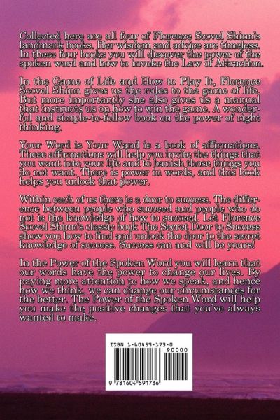 Collected here are all four of Florence Scovel Shinn's landmark books. Her wisdom and advice are timeless. In these four books you will discover the power of the spoken word and how to invoke the Law of Attraction.In the Game of Life and How to Play It, Florence Scovel Shinn gives us the rules to the game of life. But more importantly she also gives us a manual that instructs us on how to win the game. A wonderful and simple-to-follow book on the power of right thinking.Your Word is Your Wand is a book of affirmations. These affirmations will help you invite the things that you want into your life and to banish those things you do not want. There is power in words, and this book helps you unlock that power.Within each of us there is a door to success. The difference between people who succeed and people who do not is the knowledge of how to succeed. Let Florence Scovel Shinn's classic book The Secret Door to Success show you how to find and unlock the door to the secret knowledge of success. Success can and will be yours!In the Power of the Spoken Word you will learn that our words have the power to change our lives. By paying more attention to how we speak, and hence how we think, we can change our circumstances for the better. The Power of the Spoken Word will help you make the positive changes that you've always wanted to make.