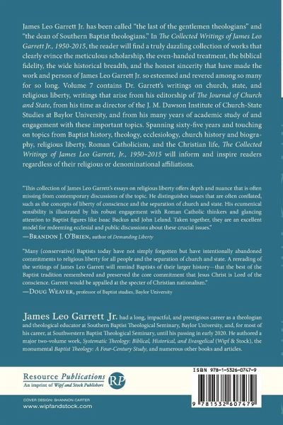 James Leo Garrett Jr. has been called ""the last of the gentlemen theologians"" and ""the dean of Southern Baptist theologians."" In The Collected Writings of James Leo Garrett Jr., 1950-2015, the reader will find a truly dazzling collection of works that clearly evince the meticulous scholarship, the even-handed treatment, the biblical fidelity, the wide historical breadth, and the honest sincerity that have made the work and person of James Leo Garrett Jr. so esteemed and revered among so many for so long. Volume 7 contains Dr. Garrett's writings on church, state, and religious liberty, writings that arise from his editorship of The Journal of Church and State, from his time as director of the J. M. Dawson Institute of Church-State Studies at Baylor University, and from his many years of academic study of and engagement with these important topics. Spanning sixty-five years and touching on topics from Baptist history, theology, ecclesiology, church history and biography, religious liberty, Roman Catholicism, and the Christian life, The Collected Writings of James Leo Garrett, Jr., 1950-2015 will inform and inspire readers regardless of their religious or denominational affiliations.