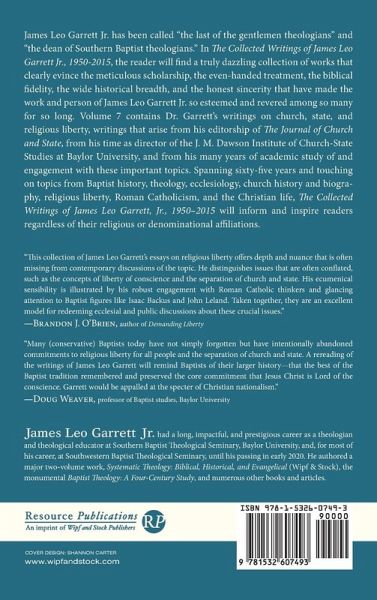 James Leo Garrett Jr. has been called ""the last of the gentlemen theologians"" and ""the dean of Southern Baptist theologians."" In The Collected Writings of James Leo Garrett Jr., 1950-2015, the reader will find a truly dazzling collection of works that clearly evince the meticulous scholarship, the even-handed treatment, the biblical fidelity, the wide historical breadth, and the honest sincerity that have made the work and person of James Leo Garrett Jr. so esteemed and revered among so many for so long. Volume 7 contains Dr. Garrett's writings on church, state, and religious liberty, writings that arise from his editorship of The Journal of Church and State, from his time as director of the J. M. Dawson Institute of Church-State Studies at Baylor University, and from his many years of academic study of and engagement with these important topics. Spanning sixty-five years and touching on topics from Baptist history, theology, ecclesiology, church history and biography, religious liberty, Roman Catholicism, and the Christian life, The Collected Writings of James Leo Garrett, Jr., 1950-2015 will inform and inspire readers regardless of their religious or denominational affiliations.