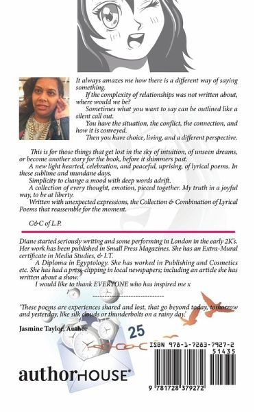 It always amazes me how there is a different way of saying something. If the complexity of relationships was not written about, where would we be? Sometimes what you want to say can be outlined like a silent call out. You have the situation, the conflict, the connection, and how it is conveyed. Then you have choice, living, and a different perspective. This is for those things that get lost in the sky of intuition, of unseen dreams, or become another story for the book, before it shimmers past. A new light hearted, celebration, and peaceful, uprising, of lyrical poems. In these sublime and mundane days. Simplicity to change a mood with deep words adrift. A collection of every thought, emotion, pieced together. My truth in a joyful way, to be at liberty. Written with unexpected expressions, the Collection & Combination of Lyrical Poems that reassemble for the moment. C&C of L.P.