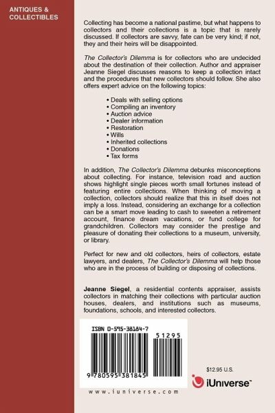 Collecting has become a national pastime, but what happens to collectors and their collections is a topic that is rarely discussed. If collectors are savvy, fate can be very kind; if not, they and their heirs will be disappointed. The Collector's Dilemma is for collectors who are undecided about the destination of their collection. Author and appraiser Jeanne Siegel discusses reasons to keep a collection intact and the procedures that new collectors should follow. She also offers expert advice on the following topics: Deals with selling options Compiling an inventory Auction advice Dealer information Restoration Wills Inherited collections Donations Tax forms In addition, The Collector's Dilemma debunks misconceptions about collecting. For instance, television road and auction shows highlight single pieces worth small fortunes instead of featuring entire collections. When thinking of moving a collection, collectors should realize that this in itself does not imply a loss. Instead, considering an exchange for a collection can be a smart move leading to cash to sweeten a retirement account, finance dream vacations, or fund college for grandchildren. Collectors may consider the prestige and pleasure of donating their collections to a museum, university, or library. Perfect for new and old collectors, heirs of collectors, estate lawyers, and dealers, The Collector's Dilemma will help those who are in the process of building or disposing of collections.