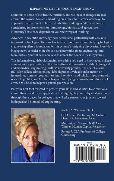 Health, wellness, and medicine catapulted to the top of people's consciousness during the pandemic. Uncertainty gripped the world as a devastating illness cast a cloud across the planet, shutting down businesses and transforming schools into virtual learning environments. Individuals awakened to a new reality, embracing fitness, mindfulness, and nutrition. Meanwhile, biomedical engineers charted a course toward improved healthcare technologies, robotic surgeries, diversified bionics, and tissue engineering. Today, labs that closed to researchers during the shutdown reopened for experimentation as new ideas percolated in scientists' minds. This transformation continues at a rapid pace enhanced by novel methods, artificial intelligence, and virtual reality. Emerging holographic tools, improved scanning, and tinier devices offer insights into organ function, neural networks, and cell signaling. On another front, biological engineers engage in farming efficiencies, toxic pollution, genetic engineering, and both marine and wildlife habitats. Furthermore, policymakers embrace biological engineers for their insights into improving the lives and livelihoods of people across the globe. If you find biology, chemistry, and physics fascinating and want to be at the forefront of tomorrow's inventions, studying biological or biomedical engineering is a great way to begin. This college guidebook describes the ins and outs of bioengineering and aids students in college admissions. Any student considering bioengineering should read this book! An engineering degree offers a ticket to an intriguing career, tools to invent the future, and financial opportunity. Yet, admission to engineering programs remains elusive. Learn how to prepare, apply, and succeed in your quest to become a bioengineer. Comb through this book of tips, tools, and university profiles. Bioengineering's mix of science and art is the epitome of creativity and problem-solving. Combining management, engineering, and design, bioengineers tirelessly produce sustainable, futuristic processes, and technologies for medical treatment, product development, and sustainability. STEAM-focused students with diverse talents will help society overcome today's unprecedented challenges. Motivated and inspired to change the future, bioengineers are on the front lines of hope and possibility. There is no other book like this anywhere. With 56 university profiles, this one-of-a-kind full-color college admissions guidebook presents valuable information on internships, summer programs, testing, interviews, and scholarships, along with research, profiles, and fun facts. Inspired by my engineering-bound students, I created this book to help you pursue your passion. Present your skills and abilities to admissions committees and gain a coveted spot in your chosen profession. Produce an application that captivates decision-makers, infusing your unique talents. Look through these pages for colleges that will take you on your journey. This book was written by Dr. Rachel Winston, an award-winning author and full-time faculty member of the year. Dr. Winston has published more than two dozen books in her 35+ years as an educator. She served as a chemist, research scientist, mathematician, quality control analyst, college professor, department chair, and college counselor.