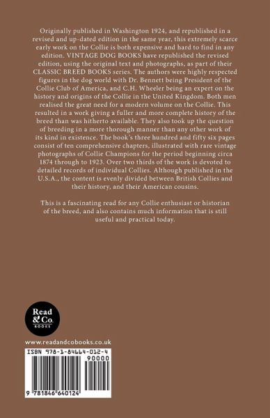 Originally published in Washington 1924, and republished in a revised and up-dated edition in the same year, this extremely scarce early work on the Collie is both expensive and hard to find in any edition. VINTAGE DOG BOOKS have republished the revised edition, using the original text and photographs, as part of their CLASSIC BREED BOOKS series. The authors were highly respected figures in the dog world with Dr. Bennett being President of the Collie Club of America, and C.H. Wheeler being an expert on the history and origins of the Collie in the United Kingdom. Both men realised the great need for a modern volume on the Collie. This resulted in a work giving a fuller and more complete history of the breed than was hitherto available. They also took up the question of breeding in a more thorough manner than any other work of its kind in existence. The book's three hundred and fifty six pages consist of ten comprehensive chapters, illustrated with rare vintage photographs of Collie Champions for the period beginning circa 1874 through to 1923. Over two thirds of the work is devoted to detailed records of individual Collies. Although published in the U.S.A., the content is evenly divided between British Collies and their history, and their American cousins. Chapters include: - Origin - History - Blue Merles - American Collies - The Typical Collie - Breeding - Foods and Feeding - Kennelling - Exhibiting - Common Ailments. This is a fascinating read for any Collie enthusiast or historian of the breed, and also contains much information that is still useful and practical today. Many of the earliest dog breed books, particularly those dating back to the 1900s and before, are now extremely scarce and increasingly expensive. VINTAGE DOG BOOKS are republishing these classic works in affordable, high quality, modern editions, using the original text and artwork.