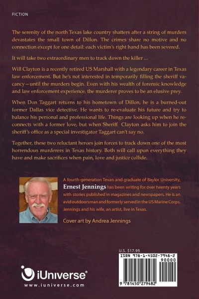 The serenity of the north Texas lake country shatters after a string of murders devastates the small town of Dillon. The crimes share no motive and no connection except for one detail: each victim's right hand has been severed. It will take two extraordinary men to track down the killer ... Will Clayton is a recently retired US Marshall with a legendary career in Texas law enforcement. But he's not interested in temporarily filling the sheriff vacancy- until the murders begin. Even with his wealth of forensic knowledge and law enforcement experience, the murderer proves to be an elusive prey. When Don Taggart returns to his hometown of Dillon, he is a burned-out former Dallas vice detective. He wants to re-evaluate his future and try to balance his personal and professional life. Things are looking up when he reconnects with a former love, but when Sheriff Clayton asks him to join the sheriff 's office as a special investigator Taggart can't say no. Together, these two reluctant heroes join forces to track down one of the most horrendous murderers in Texas history. Both will call upon everything they have and make sacrifices when pain, love and justice collide.