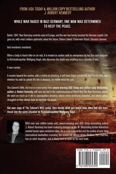"Dylan Kane leaves James Bond in his dust!" What would you do if solving a murder meant the certain death of an innocent? FROM AWARD-WINNING USA TODAY & MILLION-COPY BESTSELLING AUTHOR J. ROBERT KENNEDY WHILE WAR RAGED IN NAZI GERMANY, ONE MAN WAS DETERMINED TO KEEP THE PEACE. Berlin. 1941. Nazi Germany controls most of Europe, and the war has barely touched the German capital. Life goes on, with most civilians optimistic about the future. Bakers baked. Fishermen fished. Cleaners cleaned. And murderers murdered. When a body is found after an air raid, it is treated as routine until an anonymous tip has the case assigned to Kriminalinspektor Wolfgang Vogel, who discovers the death was anything but a casualty of war. It was murder. A murder beyond the routine, with a motive so shocking, it will leave Vogel questioning his own morality, and whether his oath to uphold the law is absolute, no matter what the cost. The Colonel's Wife, the first in a new series from award-winning USA Today and million-copy bestselling author J. Robert Kennedy, will have you lost in the mysteriousness of World War Two Nazi Germany, where life went on much as it did in cosmopolitan America, where crime continued unabated, and where police struggled as they always have to maintain the peace. Get your copy of The Colonel's Wife today, then decide what you would have done had you been thrust into the same situation as Kriminalinspektor Wolfgang Vogel...