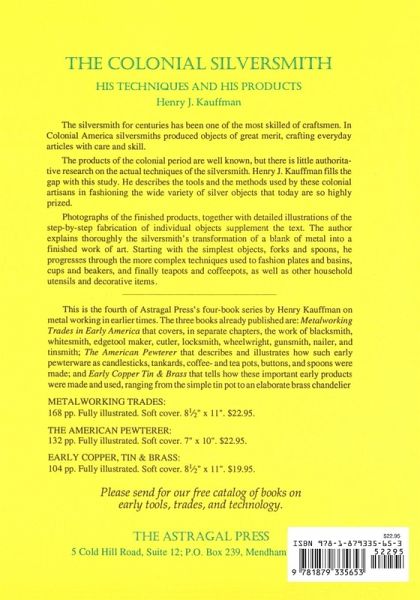 In Colonial America, silversmiths produced objects of great merit, crafting everyday articles with care and skill. The products of the colonial period are well known, but there is little authoritative research on the actual techniques of the silversmith. Henry J. Kauffman fills the gap with this study. He describes the tools and the methods used by these colonial artisans in fashioning the wide variety of silver objects that today are so highly prized. Photographs of the finished products, together with detailed illustrations of the step-by-step fabrication of individual objects, supplement the text.