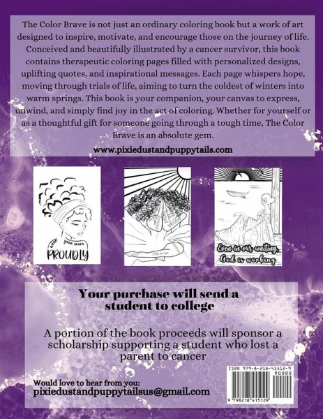 The The Color Brave is not just an ordinary coloring book but a work of art designed to inspire, motivate, and encourage those on the journey of life. Conceived and beautifully illustrated by a cancer survivor, this book contains therapeutic coloring pages filled with intricate designs, uplifting quotes, and inspirational messages. Each page whispers hope, moving through different phases and aspects of life, aiming to turn the coldest of winters into warm springs. This book is your companion, your canvas to express, unwind, and simply find joy in the act of coloring. Whether for yourself or as a thoughtful gift for someone going through a tough time, The Color Brave is an absolute gem.Color Brave is not just an ordinary coloring book but a work of art designed to inspire, motivate, and encourage those on the journey of life. Conceived and beautifully illustrated by a cancer survivor, this book contains therapeutic coloring pages filled with intricate designs, uplifting quotes, and inspirational messages. Each page whispers hope, moving through different phases and aspects of life, aiming to turn the coldest of winters into warm springs. This book is your companion, your canvas to express, unwind, and simply find joy in the act of coloring. Whether for yourself or as a thoughtful gift for someone going through a tough time, The Color Brave is an absolute gem.