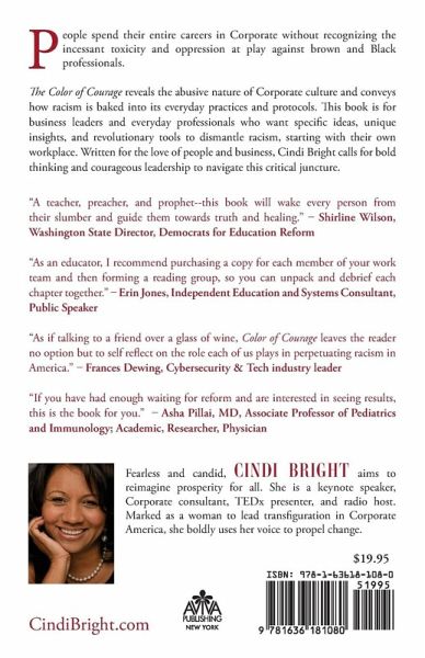 People spend their entire careers in Corporate without recognizing the incessant toxicity and oppression at play against brown and Black professionals. The Color of Courage reveals the abusive nature of Corporate culture and its racist practices and protocols. It's an urgent warning to leaders to stop having superficial conversations about anti-racism. It's time to recognize both the people and policies causing harm, and start cleaning house! Written for the love of people and business, Cindi Bright calls for bold thinking and courageous leadership to navigate this critical juncture. As a biracial, Black woman, she invites readers into her own gut-wrenching story of being fired without severance from a prominent Human Resources position. In writing this book, she vows, "The cycle of Corporate abuse stops with me!"