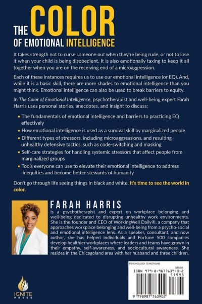 It takes strength not to curse someone out when they're being rude, or not to lose it when your child is being disobedient. It is also emotionally taxing to keep it all together when you are on the receiving end of a microaggression. Each of these instances requires us to use our emotional intelligence (or EQ). And, while it is a basic skill, there are more shades to emotional intelligence than you might think. Emotional intelligence can also be used to break barriers to equity. In The Color of Emotional Intelligence, psychotherapist and well-being expert Farah Harris uses personal stories, anecdotes, and insight to discuss:The fundamentals of emotional intelligence and barriers to practicing EQ effectively How emotional intelligence is used as a survival skill by marginalized people Different types of stressors, including microaggressions, and resulting unhealthy defensive tactics, such as code-switching and masking Self-care strategies for handling systemic stressors that affect people from marginalized groups Tools everyone can use to elevate their emotional intelligence to address inequities and become better stewards of humanity Don't go through life seeing things in black and white. It's time to see the world in color.
