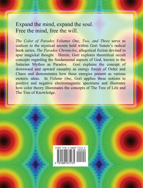Expand the mind, expand the soul. Free the mind, free the will. The Color of Paradox Volumes One, Two, and Three serve as codices to the mystical secrets held within Gori Suture's radical book series, The Paradox Chronicles, allegorical fiction devised to spur magickal thought. Herein, Gori explores theoretical occult concepts regarding the fundamental aspects of God, known in the Suturian Mythos as Paradox. Gori explains the concept of downward and upward causality as energy forces of Order and Chaos and demonstrates how these energies present as various esoteric ideas. In Volume One, Gori applies these notions to positive and negative electromagnetic spectrums and illustrates how color theory illuminates the concepts of The Tree of Life and The Tree of Knowledge. As a result of reading The Color of Paradox Volumes 1, 2, & 3, the initiate will understand four-dimensional, causality-based color theory as a lingual codex, and be able to apply this new language to occult and metaphysical concepts for an enhanced understanding of the universe.