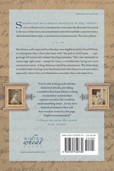 Separated by a great distance in the 1890s, can a widower and a schoolteacher overcome the obstacles that stand in the way of their love and commitment? John Feist unfolds a true-love story, old-fashioned letter style, in his historical romance novel, The Color of Rain. Handsome, well-respected local banker, now eligible bachelor, Frank Wilson is nothing less than a hot-ticket item with "the path to [his] home? a pilgrimage for unmarried women bearing casseroles." He's not interested in remarriage right away-except for Irene, a schoolteacher living two train connections away. A long-distance courtship commences. The lovers keep to weekly letter-writing since they barely have the chance to see each other, especially when trials and tribulations convolute their individual lives.
