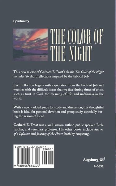This new release of Gerhard E. Frost's classic The Color of the Night includes 86 short reflections inspired by the biblical Job. Each reflection begins with a quotation from Job and wrestles with the difficult issues that we face during times of crisis, such as trust in God, the meaning of life, and fairness in the world. With newly added questions for reflection and discussion, this thoughtful book is ideal for individual and group study in Lent (or any season) or for personal devotion.
