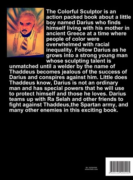 The Colorful Sculptor is an action packed book about a little boy named Darius who finds himself living with his mother in ancient Greece at a time where people of color were overwhelmed with racial inequality. Follow Darius as he grows into a strong young man whose sculpting talent is unmatched until a welder by the name of Thaddeus becomes jealous of the success of Darius and conspires against him. Little does Thaddeus know, Darius is not an ordinary man and has special powers that he will use to protect himself and those he loves. Darius teams up with Ra Selah and other friends to fight against Thaddeus,the Spartan army, and many other enemies in this exciting book.