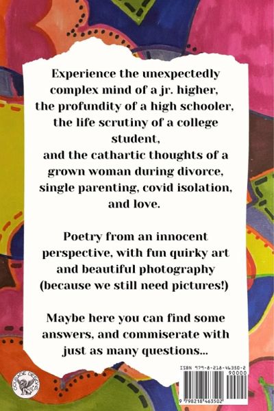 In this book, "the colors of mud" you'll experience the unexpectedly complex mind of a jr. higher, the profundity of a high schooler, the life scrutiny of a college student, and the cathartic thoughts of a grown woman during divorce, single parenting, covid isolation, and love. Buffy Jo Grenier brings together here just a few of her short poetry pieces collected throughout her entire lifetime. They come from an innocent and forthright perspective, with fun quirky art and beautiful photography (because sometimes we just wanna look at the pictures!) Maybe here you can find some answers, and commiserate with just as many questions...